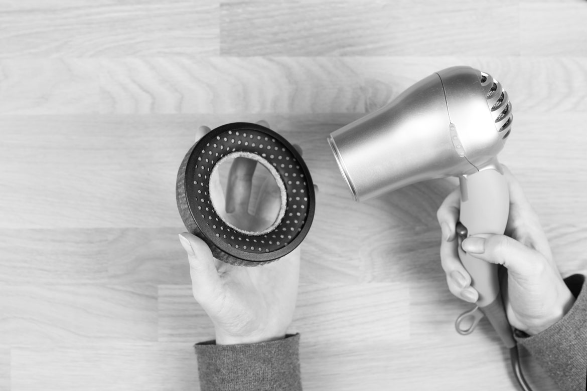 - DT 770/880/990 PRO: Son adım biraz zorlayıcı olabilir. Önce yeni kulak yastığının lastik kenarını bir saç kurutma makinesiyle ısıtın (ancak en sıcak ayarda değil!). Isı, lastik kenarı daha esnek hale getirecektir. Şimdi, bir taraftan başlayarak, kulak yastığını kademeli olarak gövdenin kenarı üzerinden çekin. Kenarı her taraftan geçirdiğinizde, doğru takılıp takılmadığını kontrol etmek için kulak yastığını döndürün.