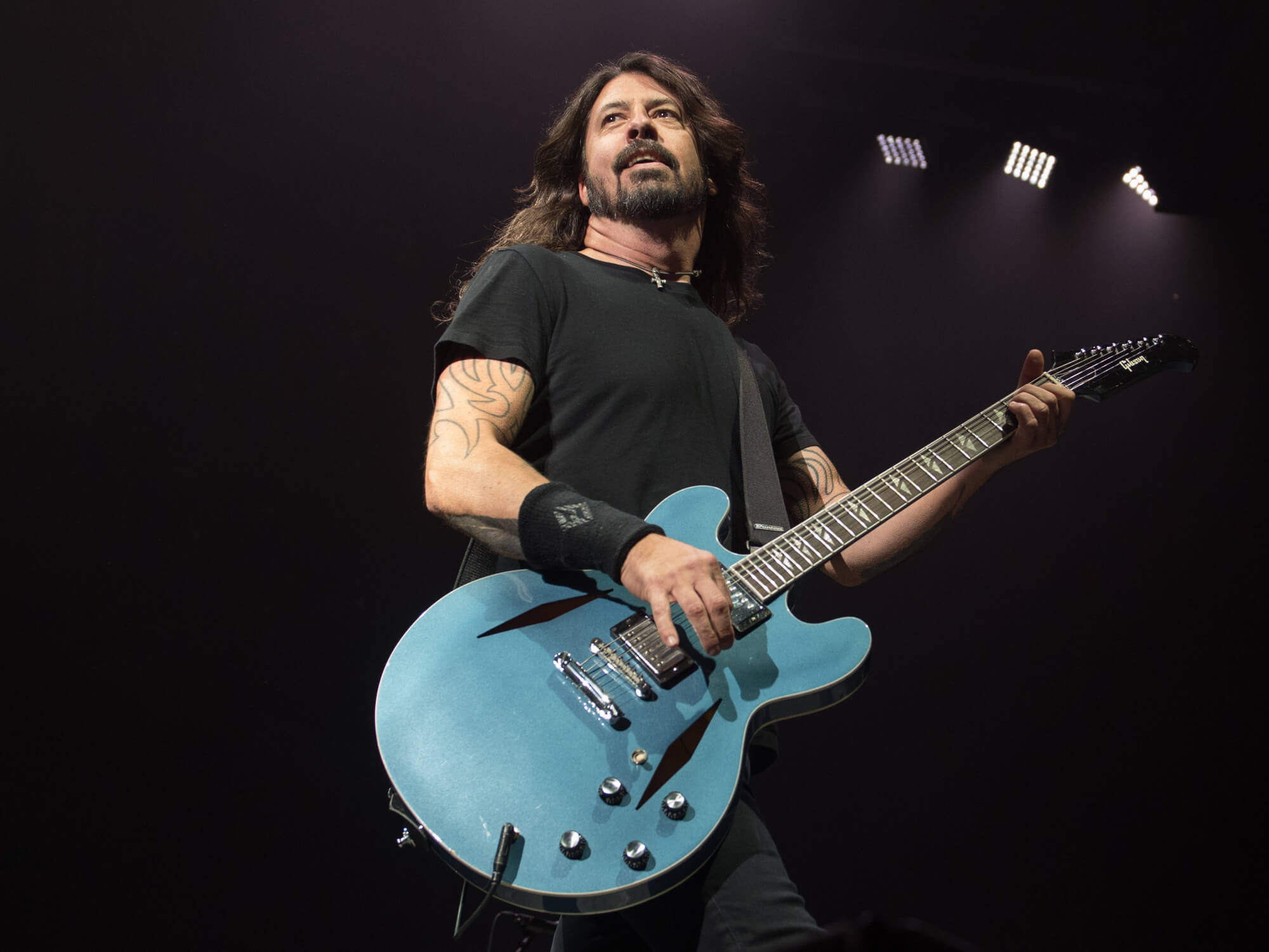 | Epiphone DG-335 | Burstbucker manyetikler & Pelham Blue renk | Dave’in 20 yıldır vazgeçemediği ana sahne gitarı. |